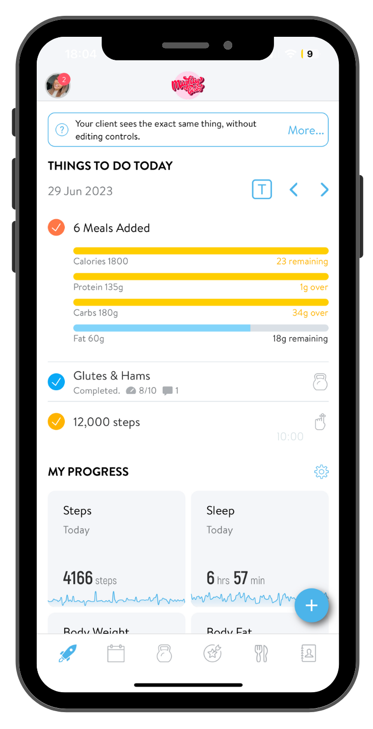 A completely bespoke training plan to suit your goals, flexible to how you like to exercise. Whether that’s at home or at the gym, it’s your plan! All of our clients access to the app for form videos, check ins, and more.